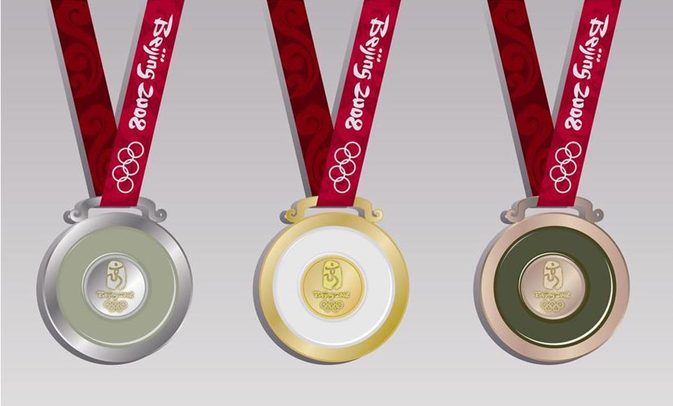 北京奥运会奖牌的直径是70毫米,厚度是6毫米。奖牌创意取自中国古代龙纹网壁造型,由象征尊贵和谐,美德的“金”、“玉”的材质组合而成。